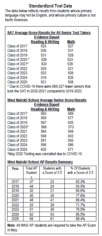 WNS uses North American curriculum and standardized testing is administered to grades 1-11 each year. WNS offers a broad range of Advanced Placement (AP) courses, including the prestigious AP Capstone Diploma program.